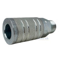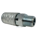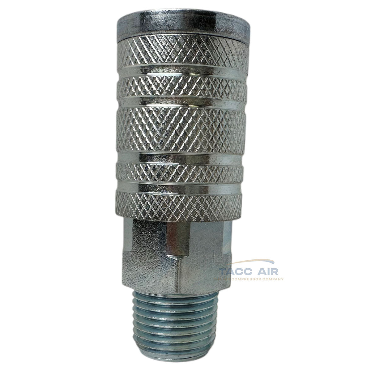 Made of durable steel for rugged performance, the coupler is designed to handle heavy impact and demanding job site conditions. It features a male 1/2" NPT pipe thread, which measures 3/4" in diameter.
