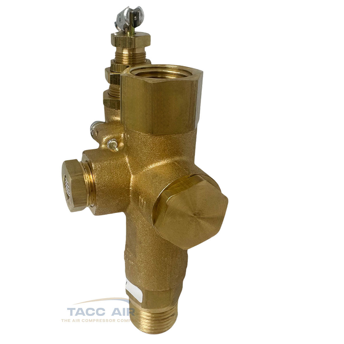 The valve includes a 1/2" female NPT top inlet, a 1/2" male NPT outlet to the tank connection, and a 1/8" female NPT port on the back for throttle or unloader control. It’s factory set to operate between 140 and 175 PSI and features a built-in manual unloader valve. The unloader exhaust outlet also has a muffler to reduce noise during unload.