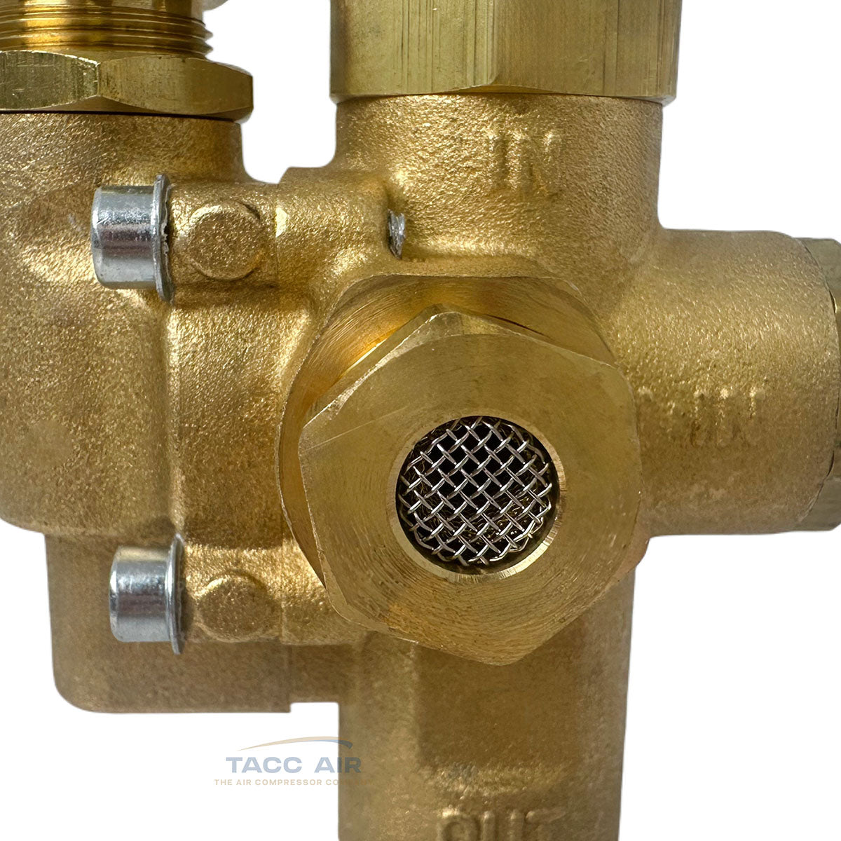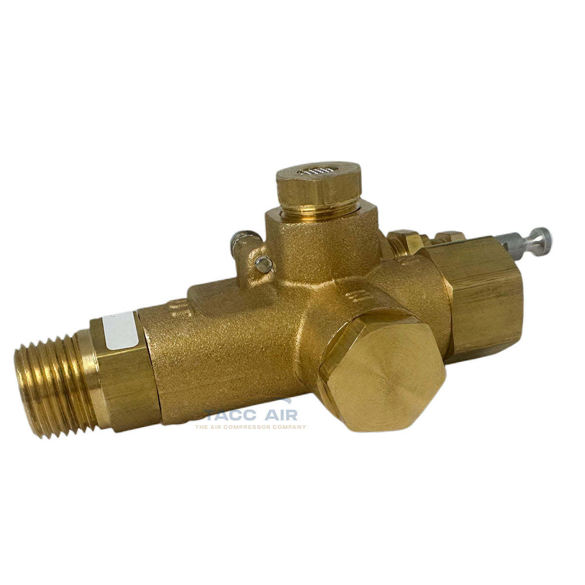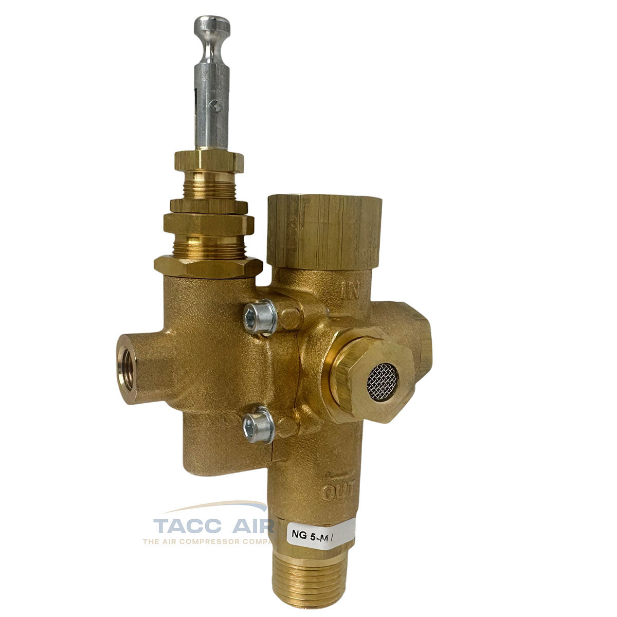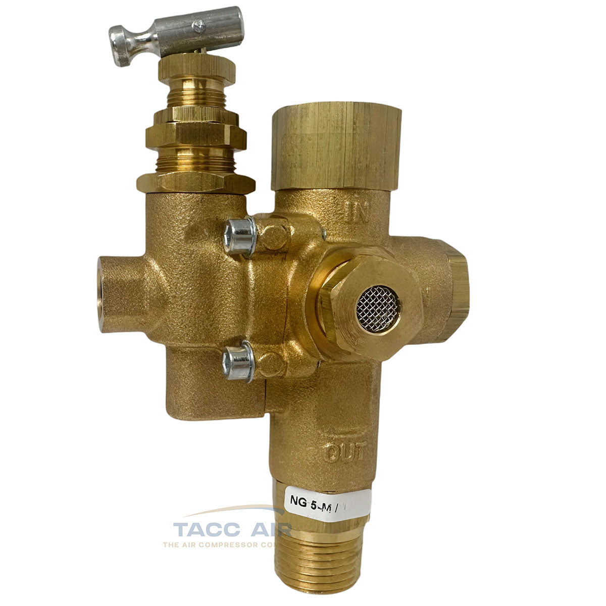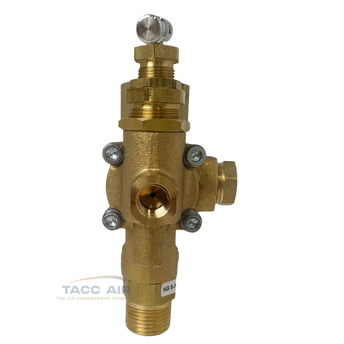 This is a U.S.-made NG series combo valve from Conrader, built for use with gas-powered or electric constant-run air compressors. It combines a pilot valve, discharge valve, and check valve in one.