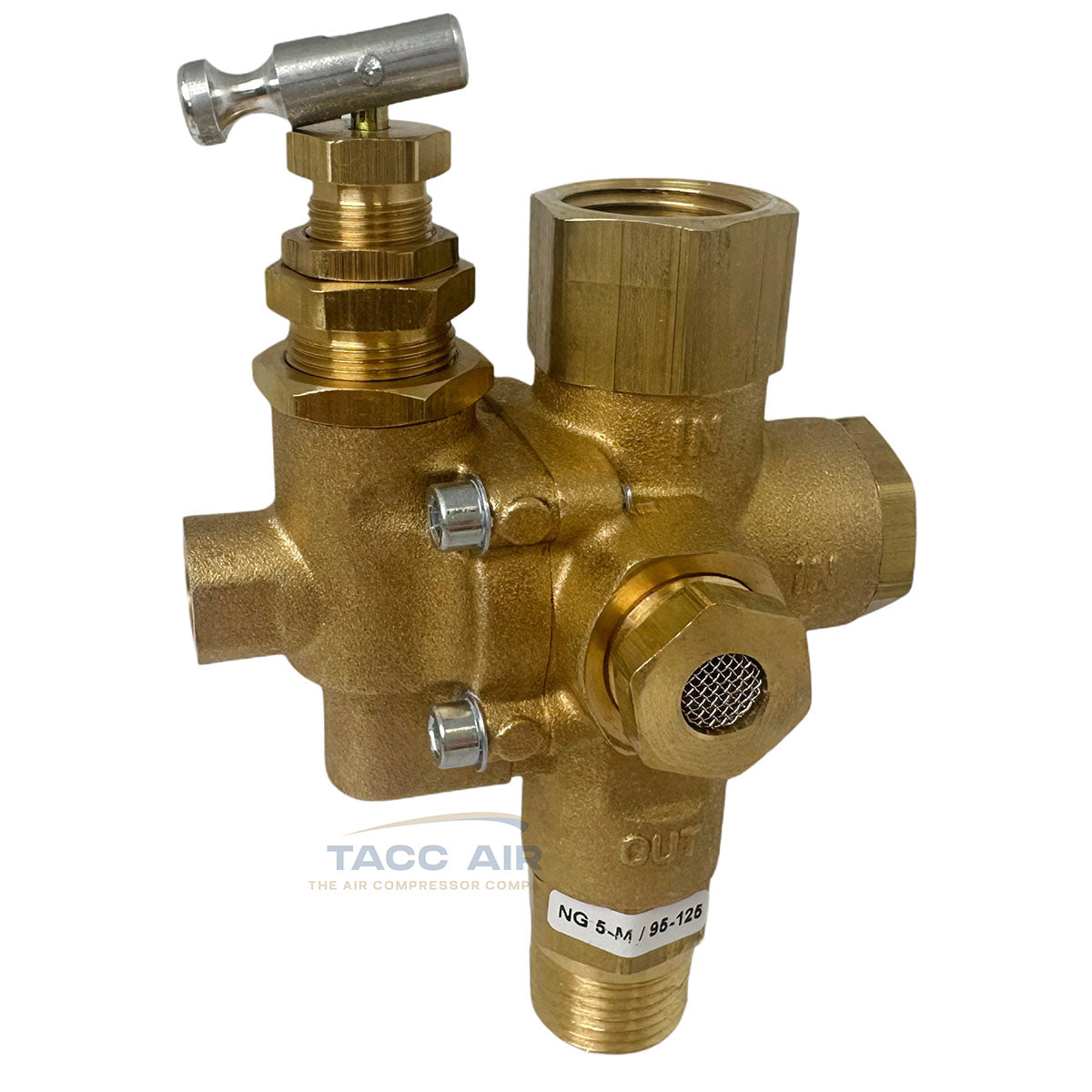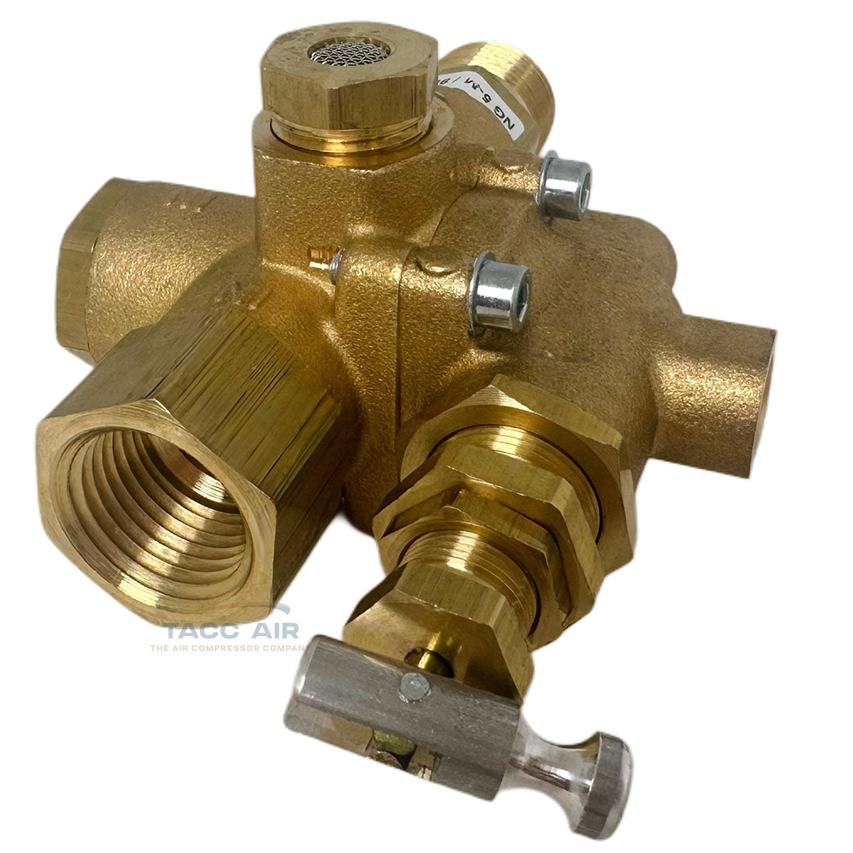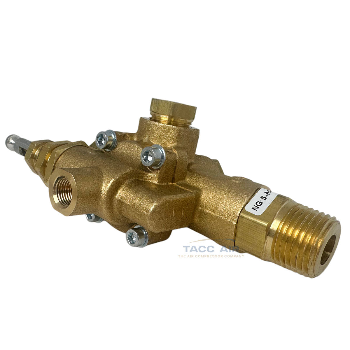 This is a U.S.-made NG series combo valve from Conrader, built for use with gas-powered or electric constant-run air compressors. It combines a pilot valve, discharge valve, and check valve in one.
