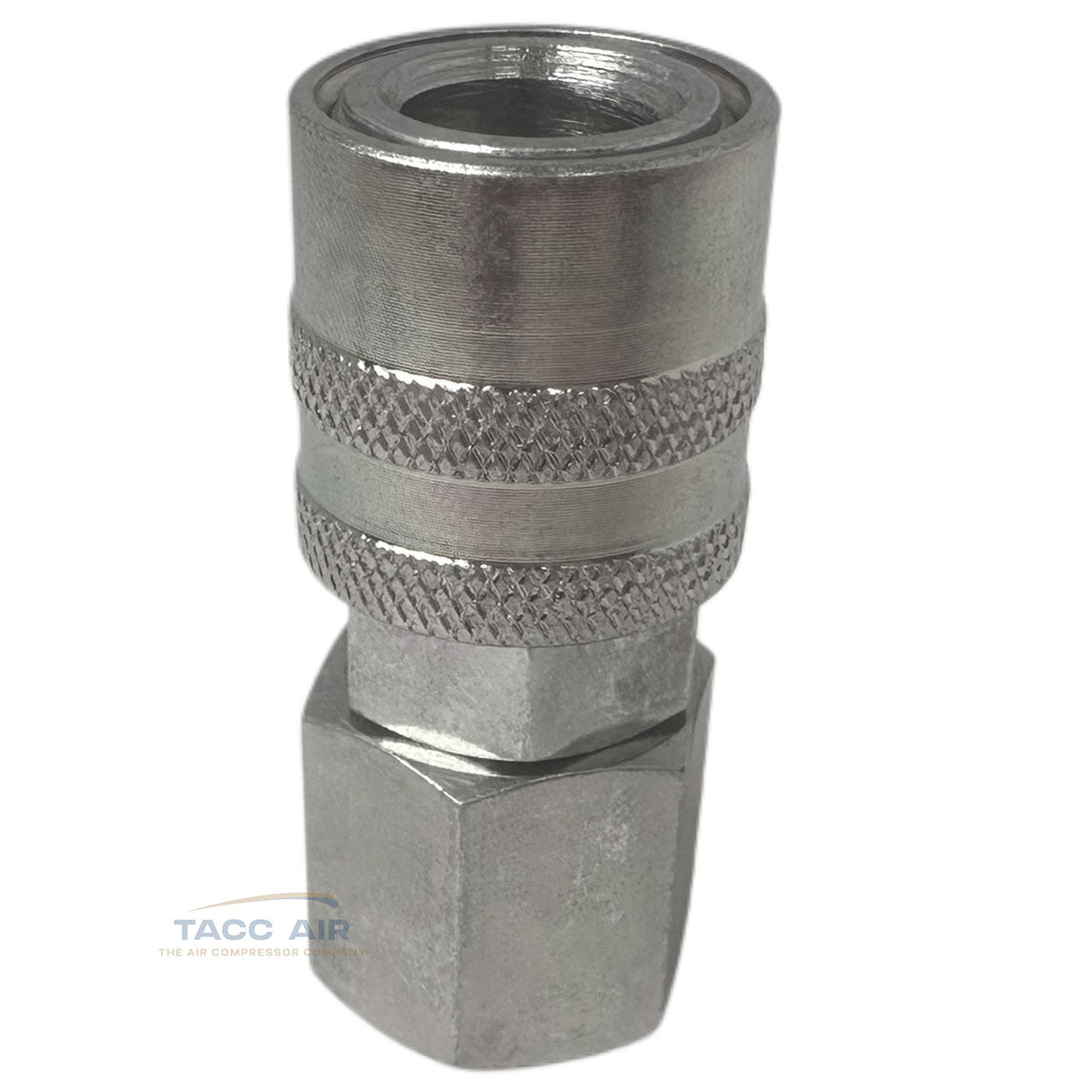 This steel industrial-style quick coupler is built tough for heavy-duty air applications, featuring 3/8" female NPT threads (note: 3/8" NPT measures approximately 5/8" in diameter). Designed to fit Milton Type M-series 1/4" body plugs, this is the most common and widely used coupler style in the market.