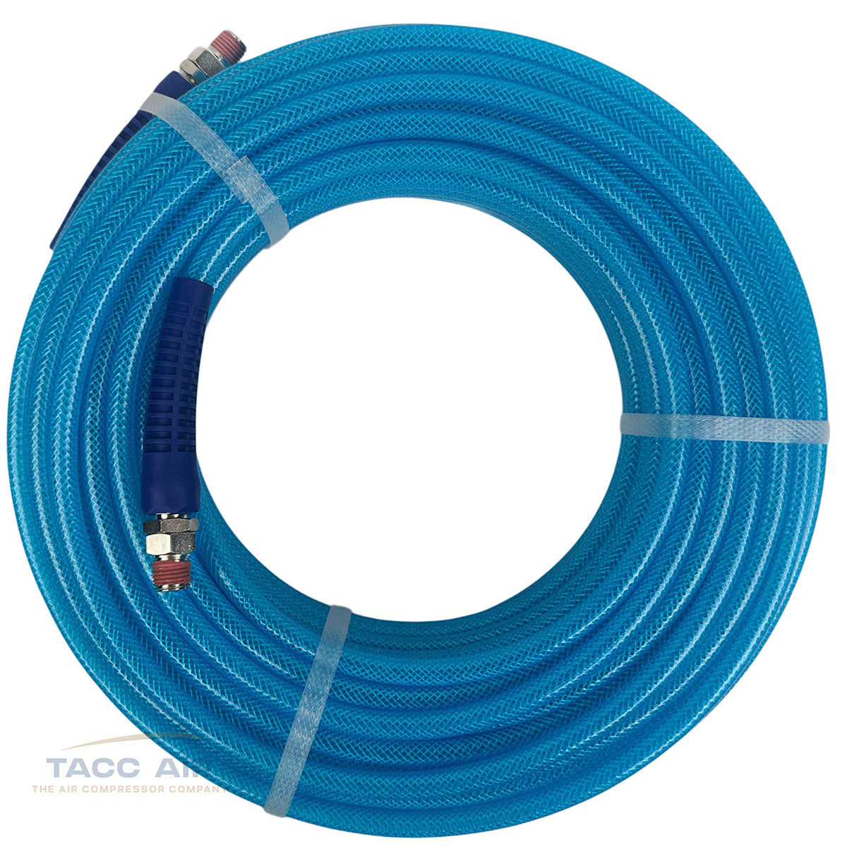 1/4 Inch Blue Polyurethane Air Hose x 100 Ft With 1/4" Male NPT Swivel End Fittings, 200 PSI – Contractor-Grade Pneumatic Air Compressor Hose
