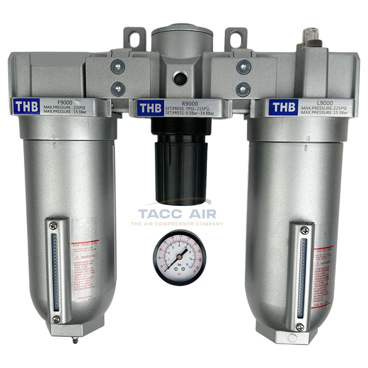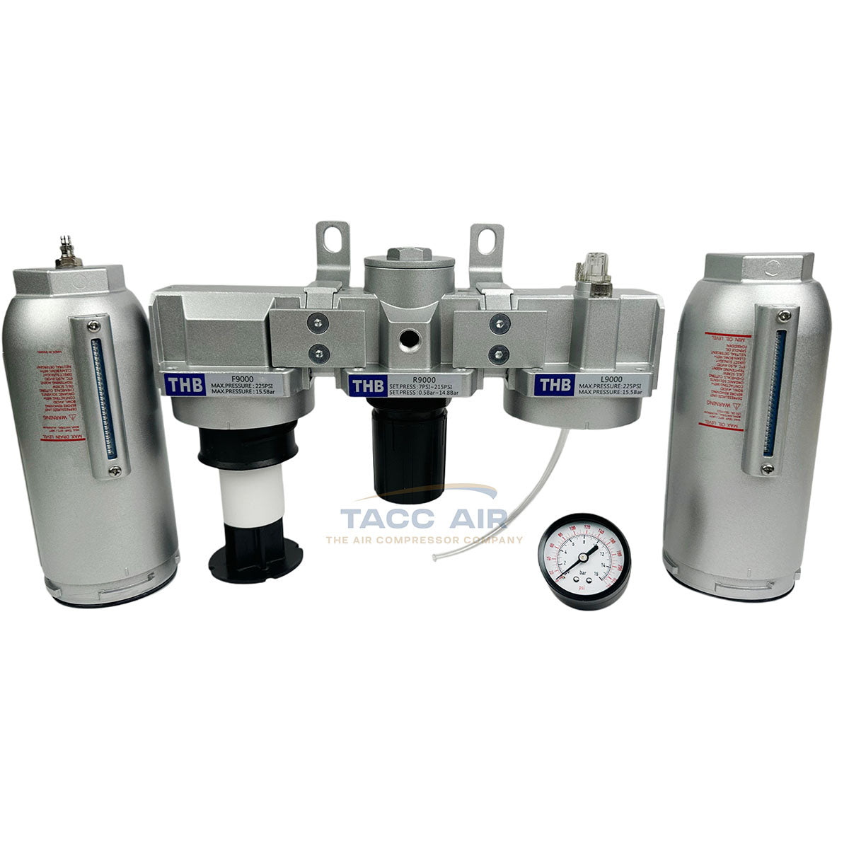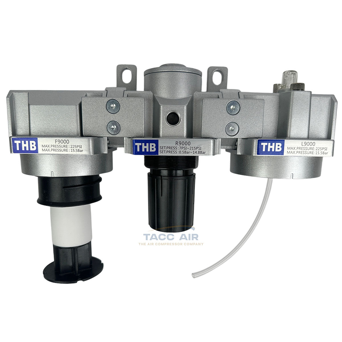 This 3-stage in-line FRL (Filter, Regulator, Lubricator) combo unit is a compact, high-flow solution for compressed air systems where space is limited but full functionality is needed. Designed to manage moisture, control air pressure, and lubricate airline tools in one integrated unit, this setup is ideal for workshops, industrial environments, or anywhere reliable air quality is critical for high CFM applications.