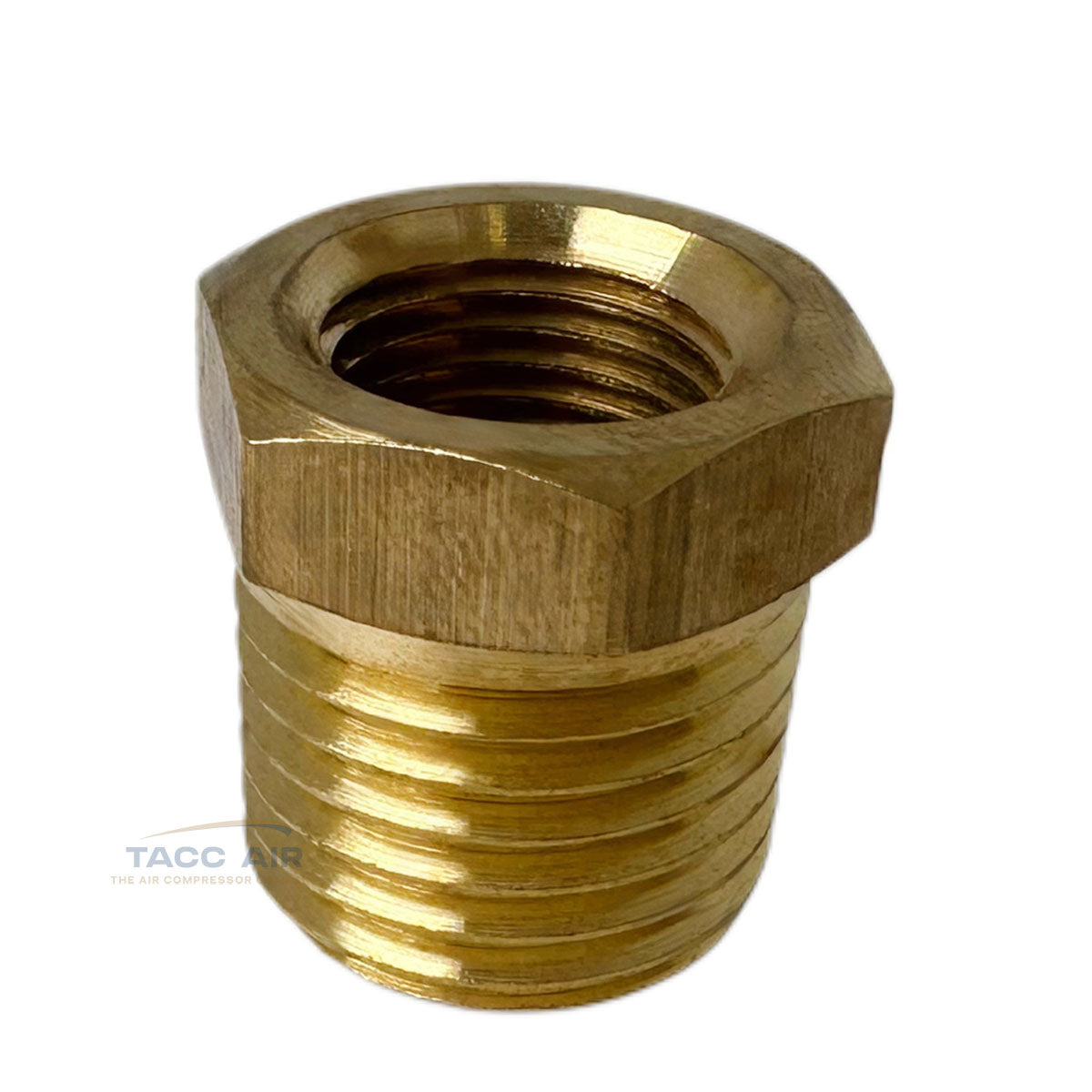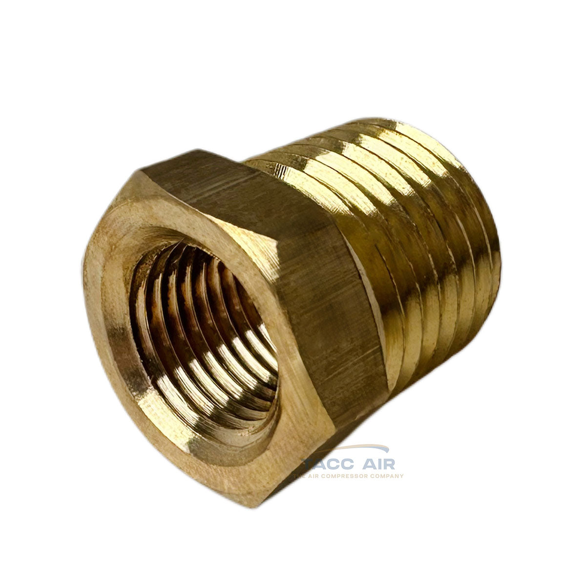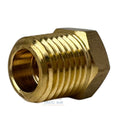 This brass hex reducing bushing features a 1/8" FNPT (female National Pipe Thread) connection on the inside and a 1/4" MNPT (male National Pipe Thread) on the outer threads. This reducer bushing has a hex top ideal for applications requiring a secure hold with a wrench during installation.