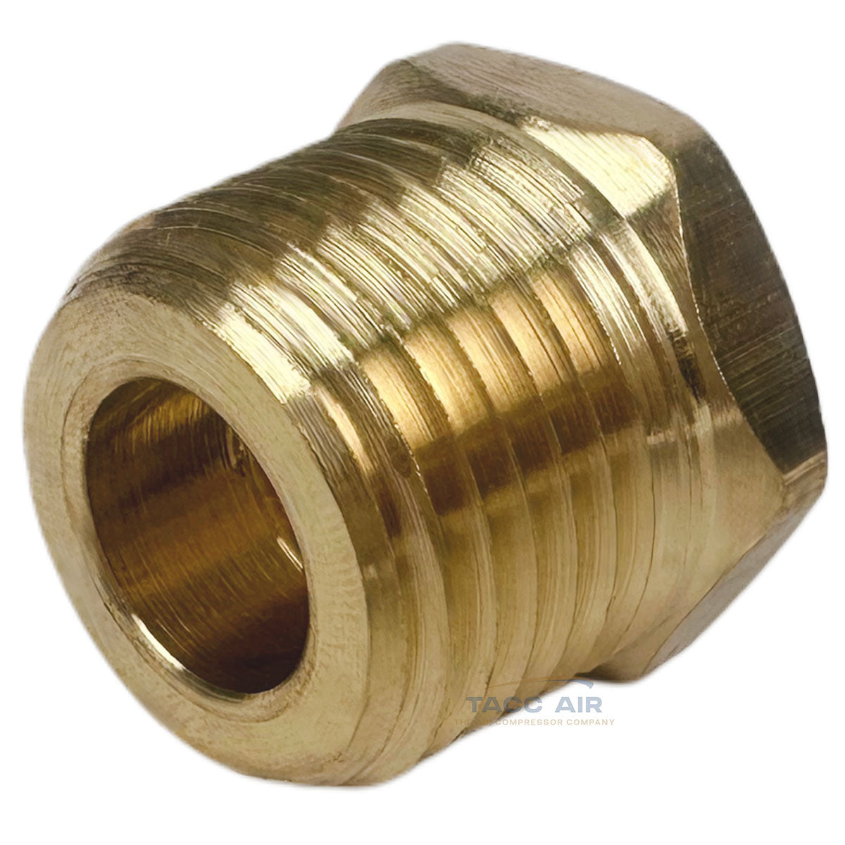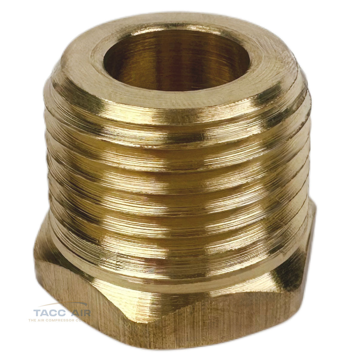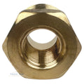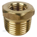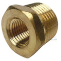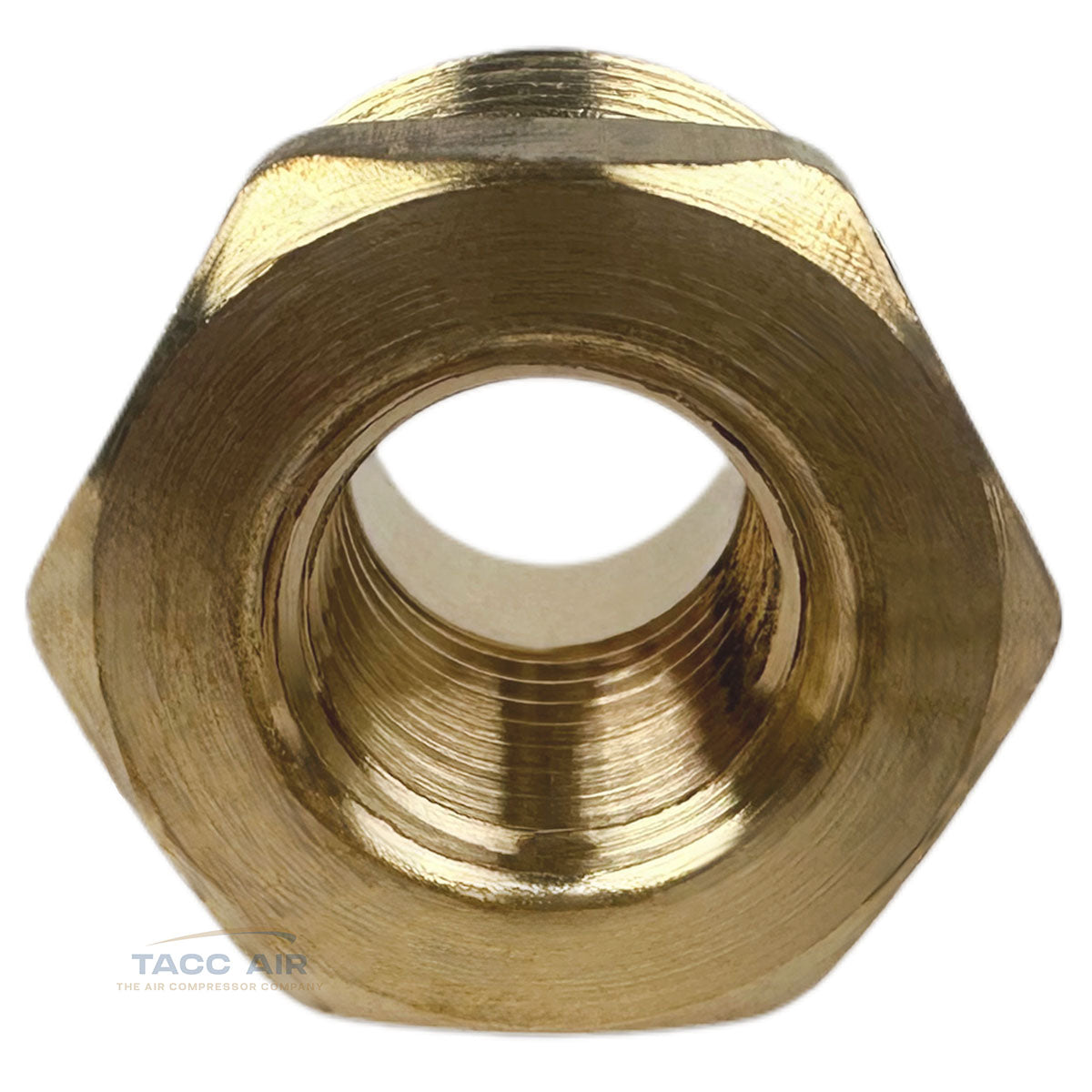 This brass hex reducing bushing features a 1/4" FNPT (female National Pipe Thread) connection on the inside and a 1/2" MNPT (male National Pipe Thread) on the outer threads. This reducer bushing has a hex top ideal for applications requiring a secure hold with a wrench during installation.