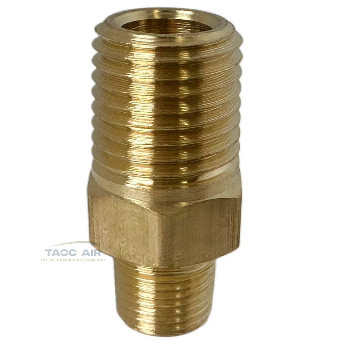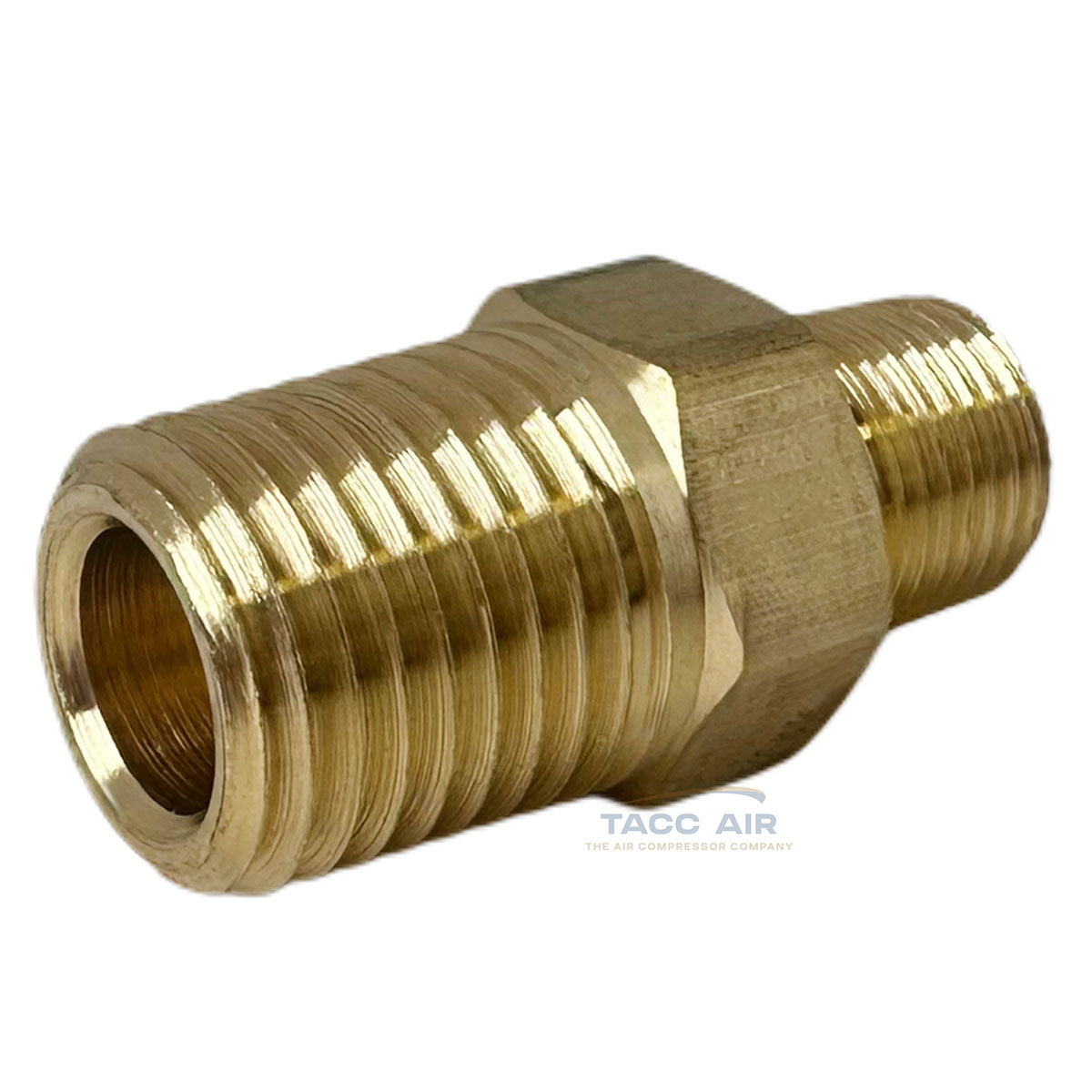 This brass reducing nipple features a 1/4" NPT male thread on one end and a 1/8" NPT male thread on the other, making it ideal for reducing or increasing pipe thread sizes in your system. It’s a reliable solution for connecting components with different thread sizes in a compact and efficient way.