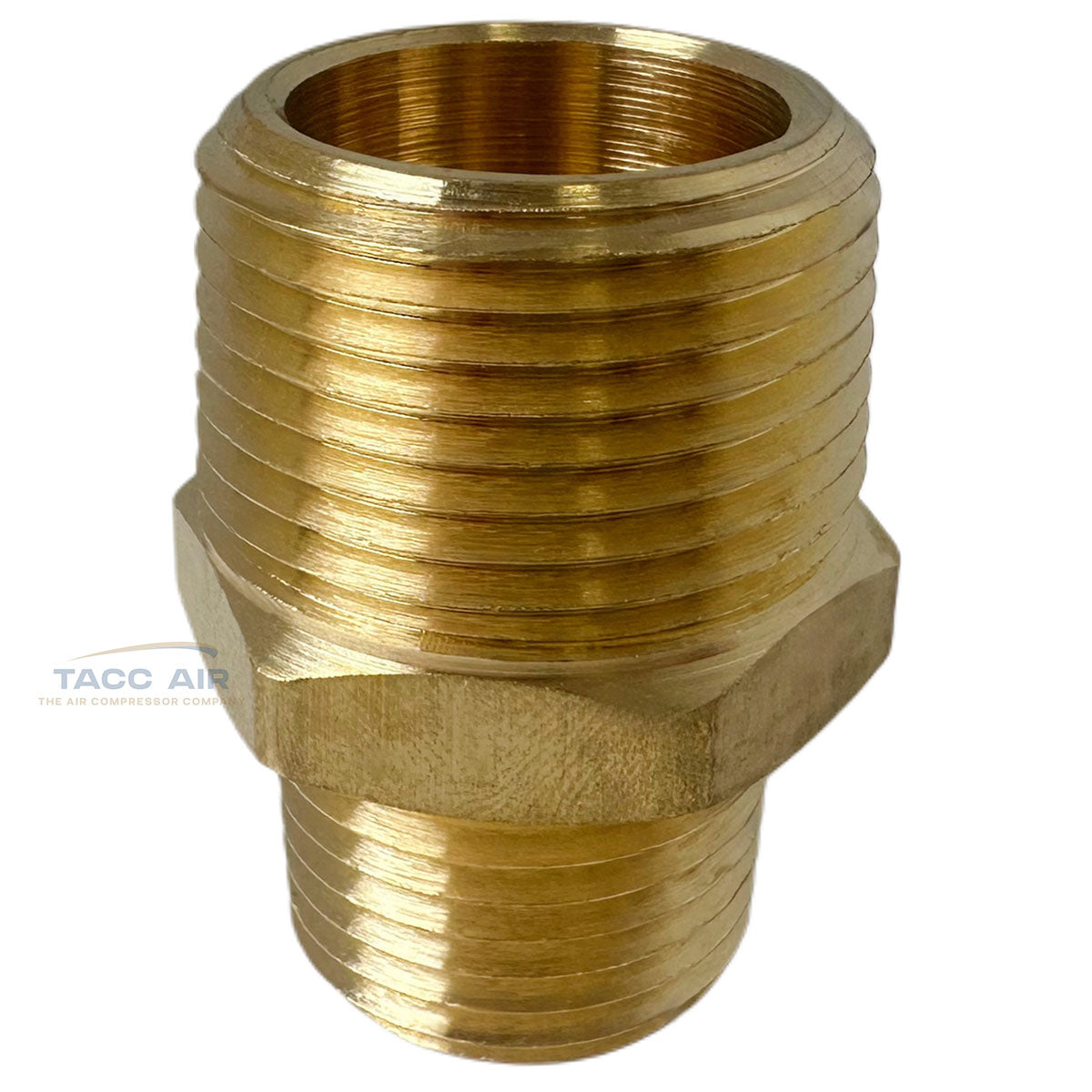 This brass reducing nipple features a 3/4" NPT male thread on one end and a 1/2" NPT male thread on the other, making it ideal for reducing or increasing pipe thread sizes in your system. It’s a reliable solution for connecting components with different thread sizes in a compact and efficient way.
