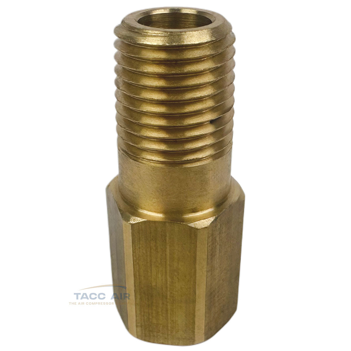 This brass pipe fitting extender features a 1/4" NPT female thread on one end and a 1/4" NPT male thread on the other, designed to extend standard 1/4" NPT pipe connections in compressed air, gas, oil, or water systems. It's a practical solution for adding extra clearance or length in tight or confined installation areas without changing the fitting type or size.