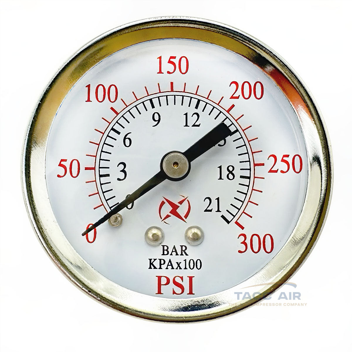This durable and reliable pressure gauge is designed for a wide range of uses, offering precise pressure readings up to 300 PSI. The 2-inch dial and standard 1/4" NPT back mount threads make it easy to install on compressors, tanks, and other systems. Built with a chrome steel case and bezel, this gauge is both rugged and corrosion-resistant.