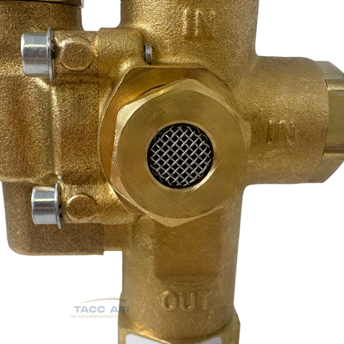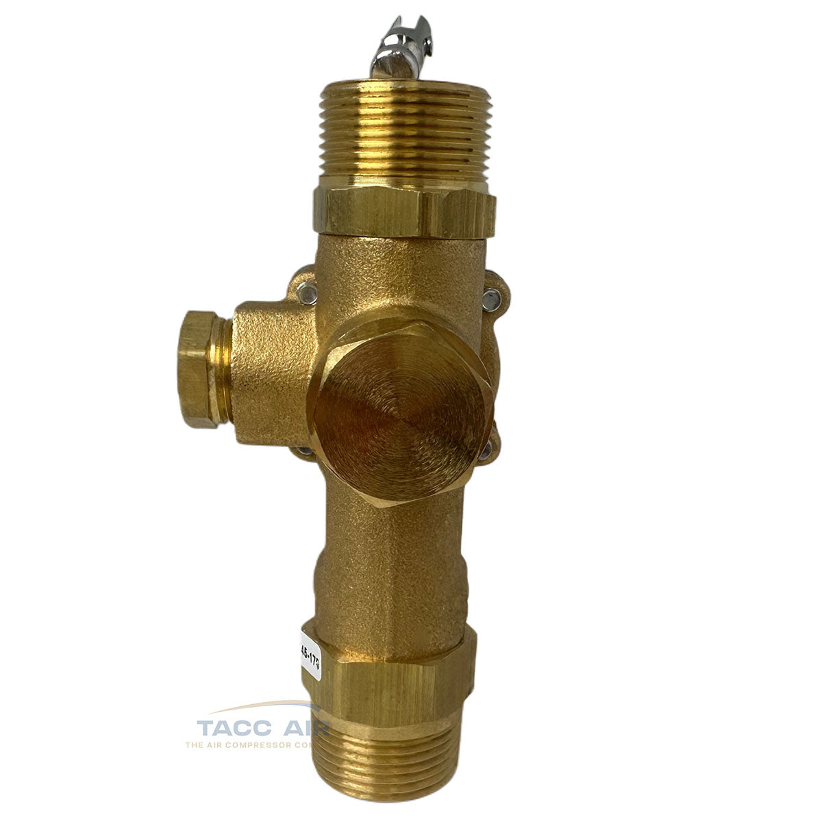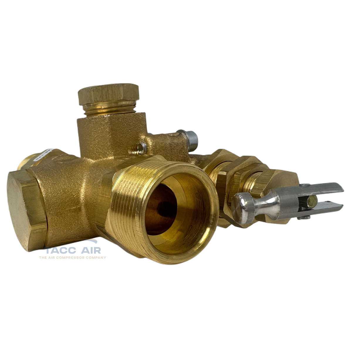 The valve includes a 3/4" compression top inlet for copper tubing, a 3/4" male NPT outlet to the tank connection, and a 1/8" female NPT port on the back for throttle or unloader control. It’s factory set to operate between 145 and 175 PSI and features a built-in manual unloader valve. The unloader exhaust outlet also has a muffler to reduce noise during unload.