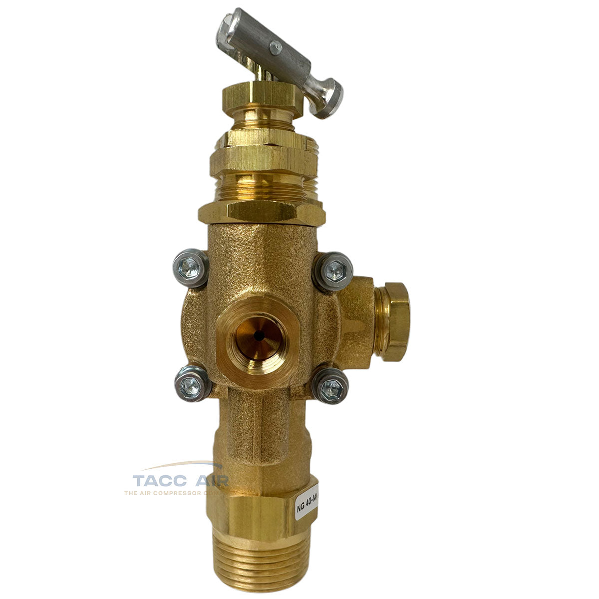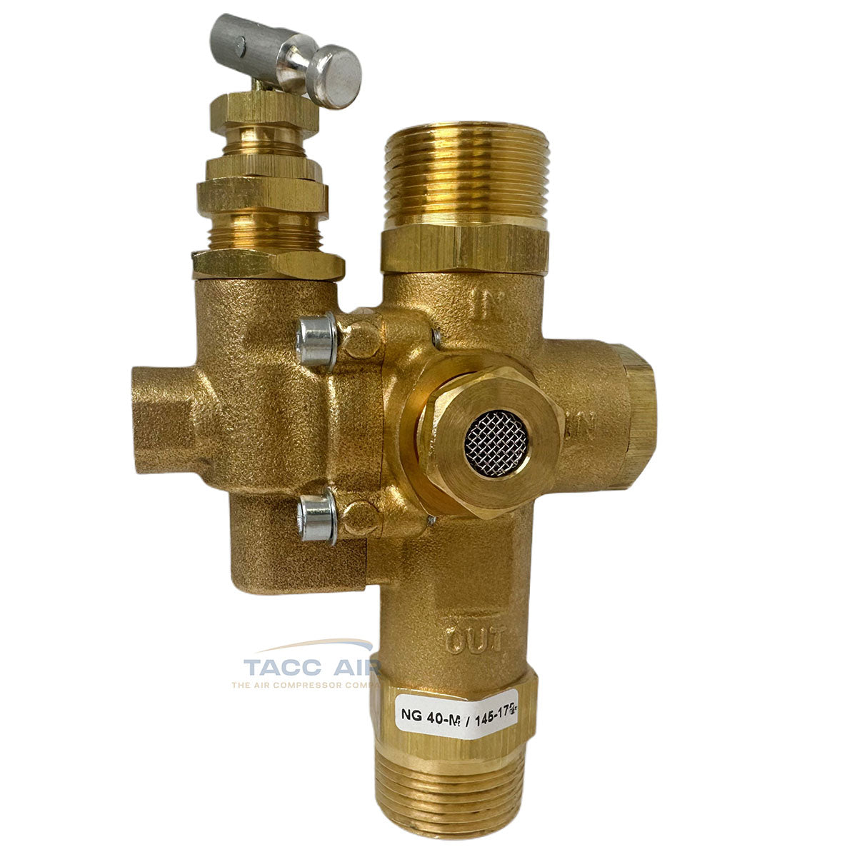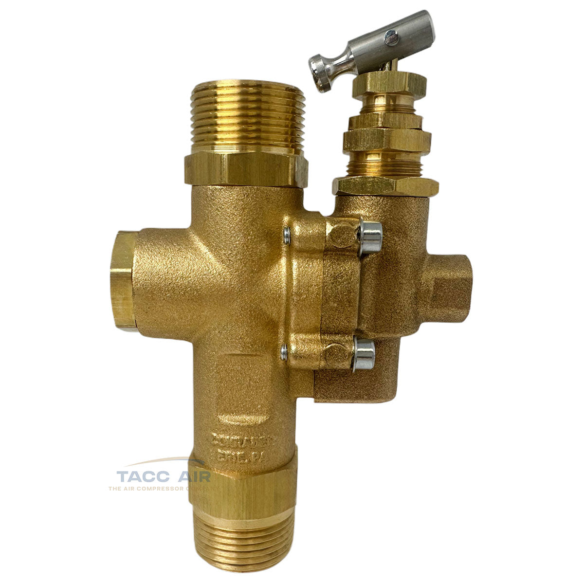 This is a U.S.-made NG series combo valve from Conrader, built for use with gas-powered or electric constant-run air compressors. It combines a pilot valve, discharge valve, and check valve in one.