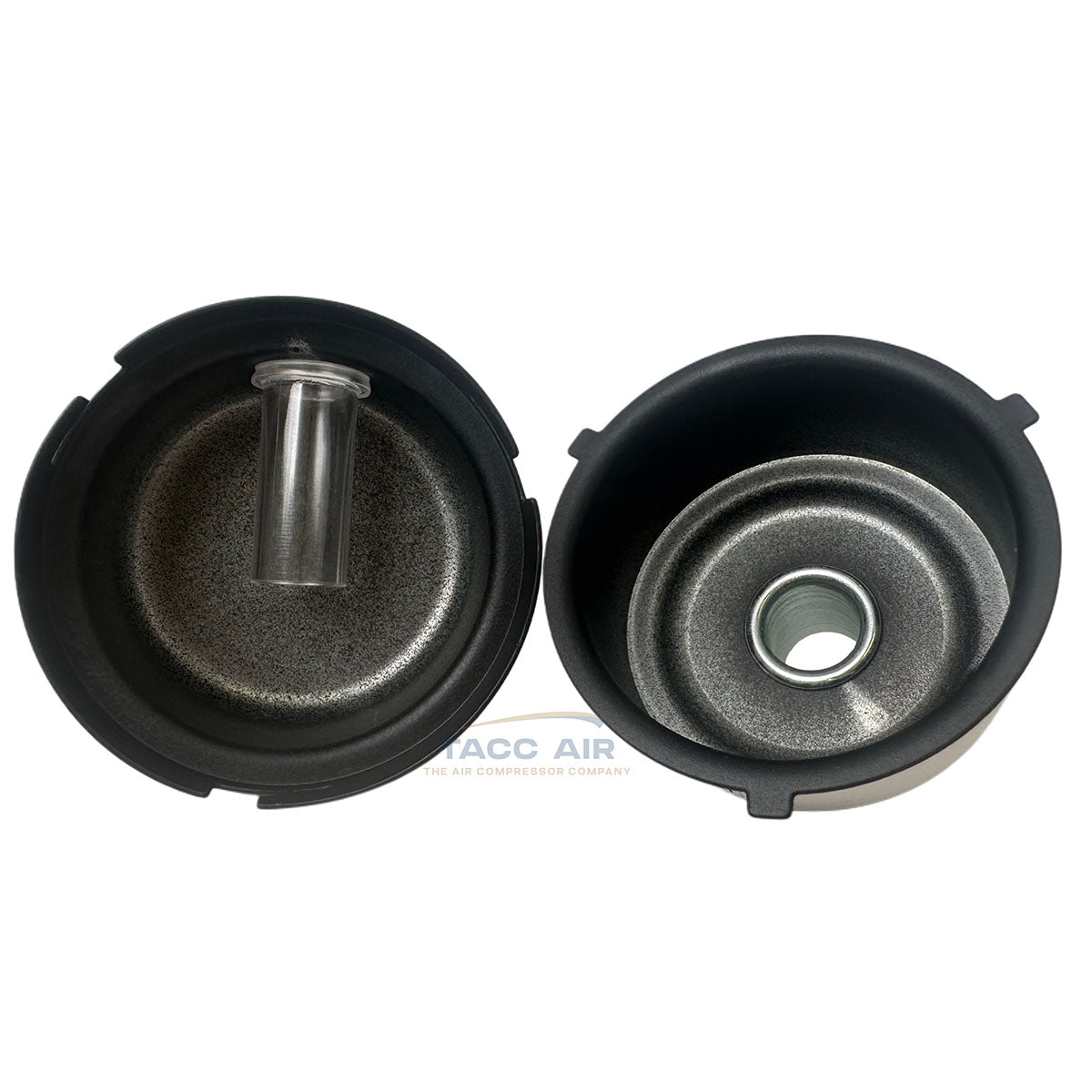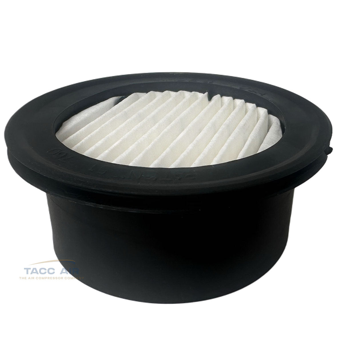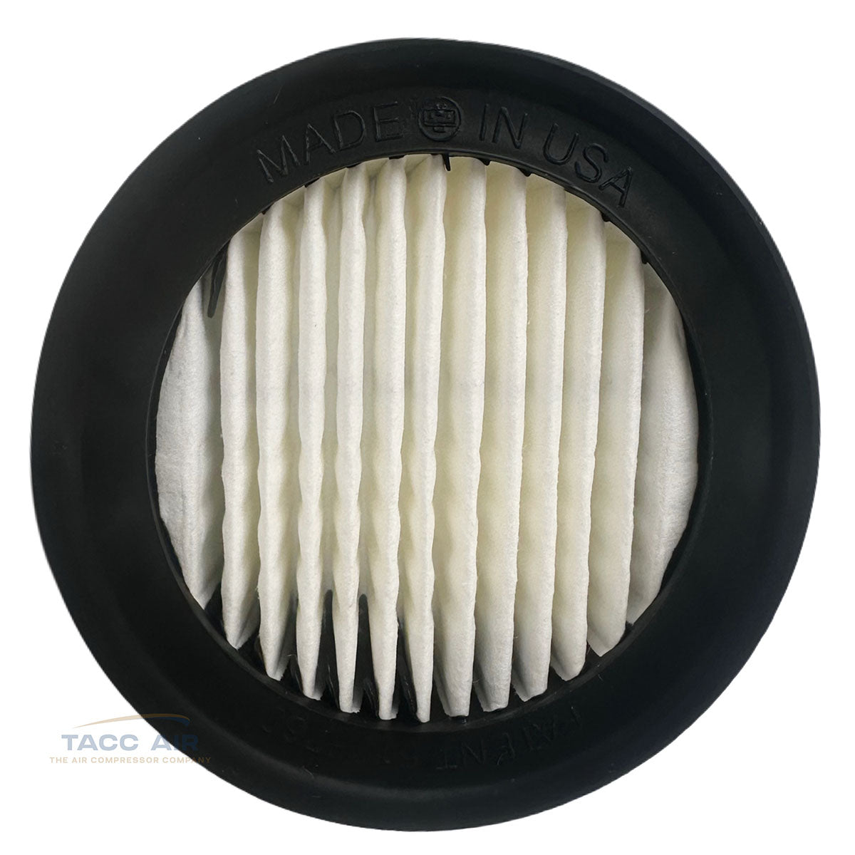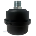 Brand new Solberg air compressor air filter and silencer housing with element. This is a high-quality complete intake filter assembly designed to reduce compressor noise while maintaining optimal airflow performance. The included filter element measures 2" in diameter at the insertable portion of the element, 2-3/8" diameter at the widest point around the seal of the element, and 1" tall. The housing is 2.1" tall (without the thread), 2.5" in diameter, and features a 3/8" male NPT pipe thread connection for easy installation.