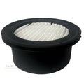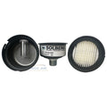 Includes pancake filter element measuring 2" in diameter at the insertable portion of the element, 2-3/8" diameter at the widest point around the seal of the element, and 1" tall