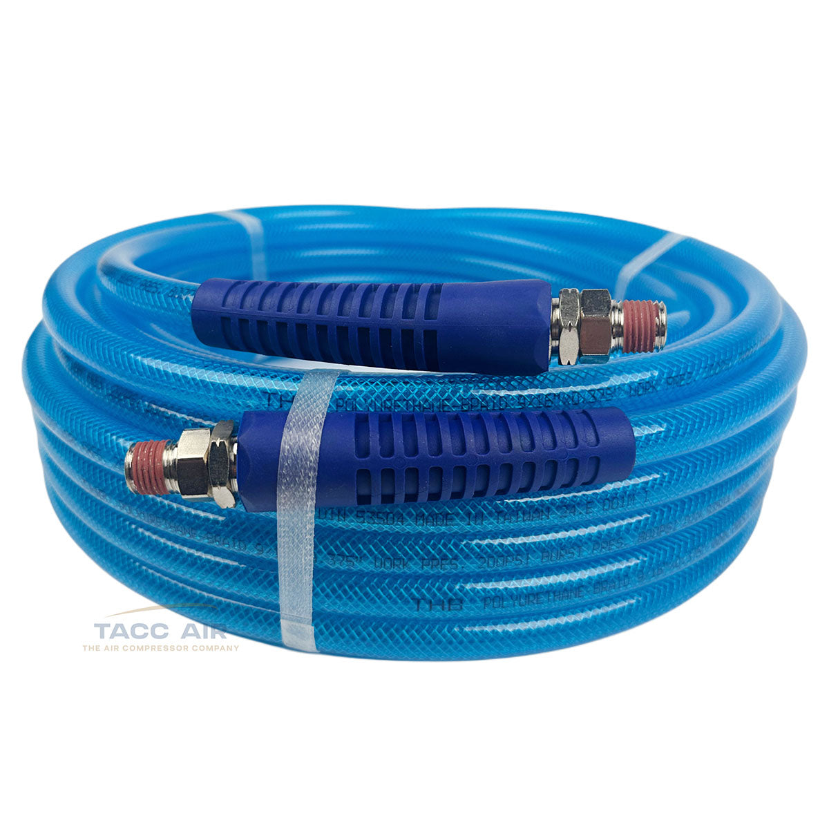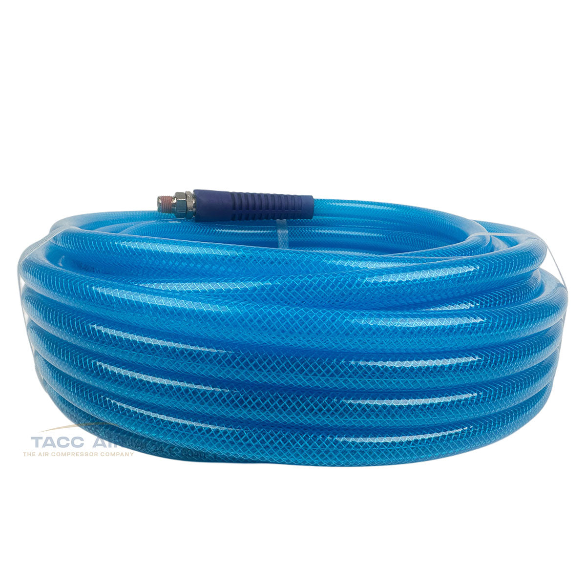 3/8 Inch Blue Polyurethane Air Hose x 50 Ft With 1/4" Male NPT Swivel End Fittings, 200 PSI – Contractor-Grade Pneumatic Air Compressor Hose