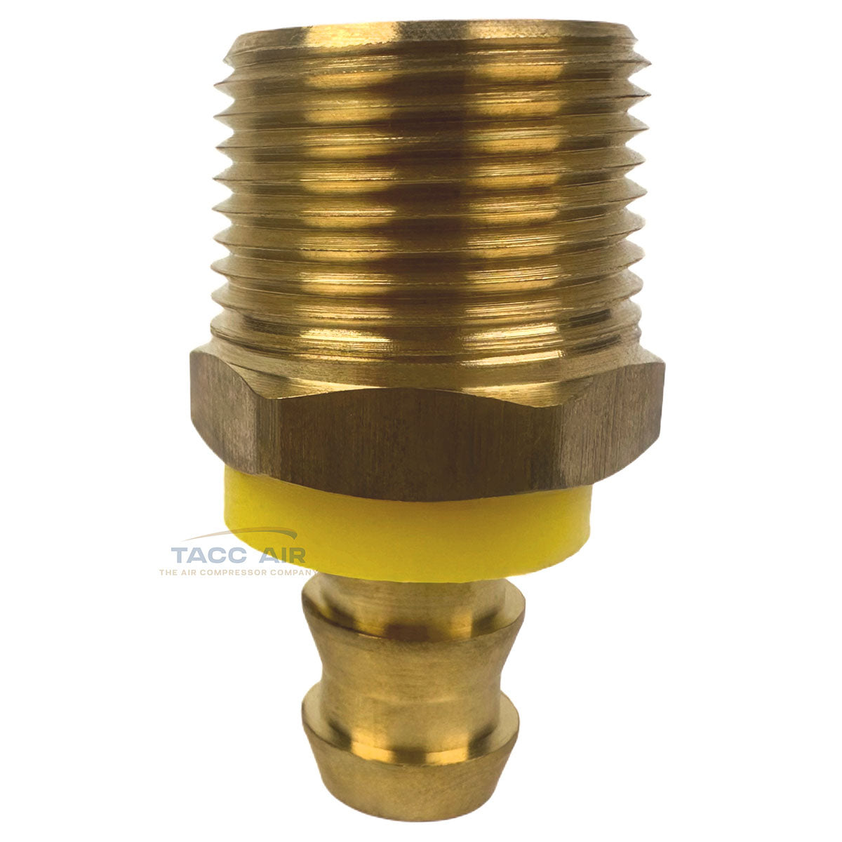 Engineered for 1/2" internal diameter (I.D.) push lock air hoses. The barbed design provides a secure, leak-free connection when properly installed. The yellow collar must remain on the fitting during installation, and the hose must be fully seated and pressed against the yellow collar for proper installation.