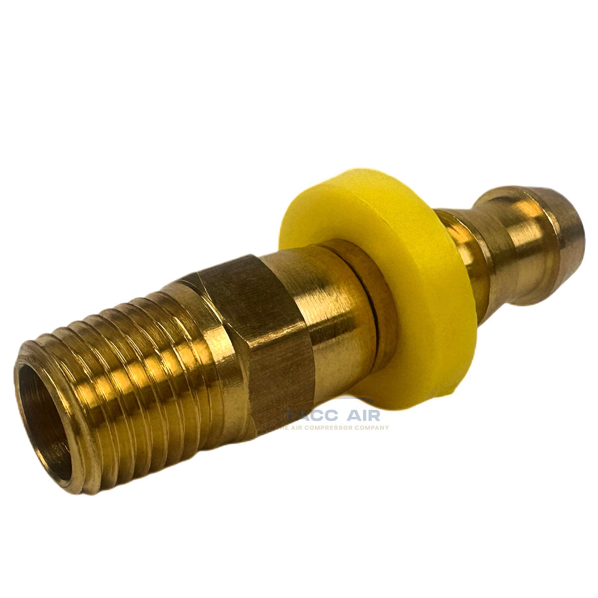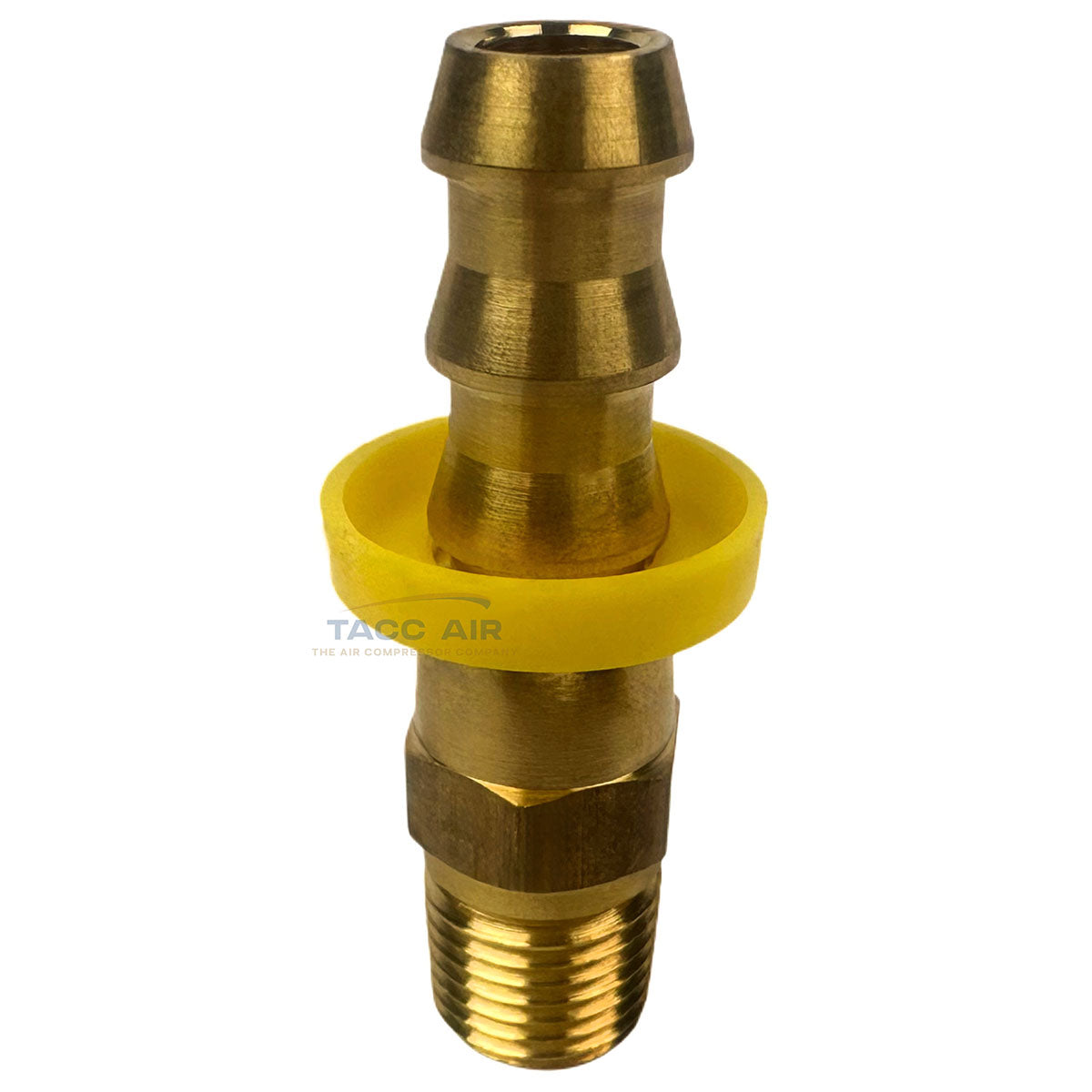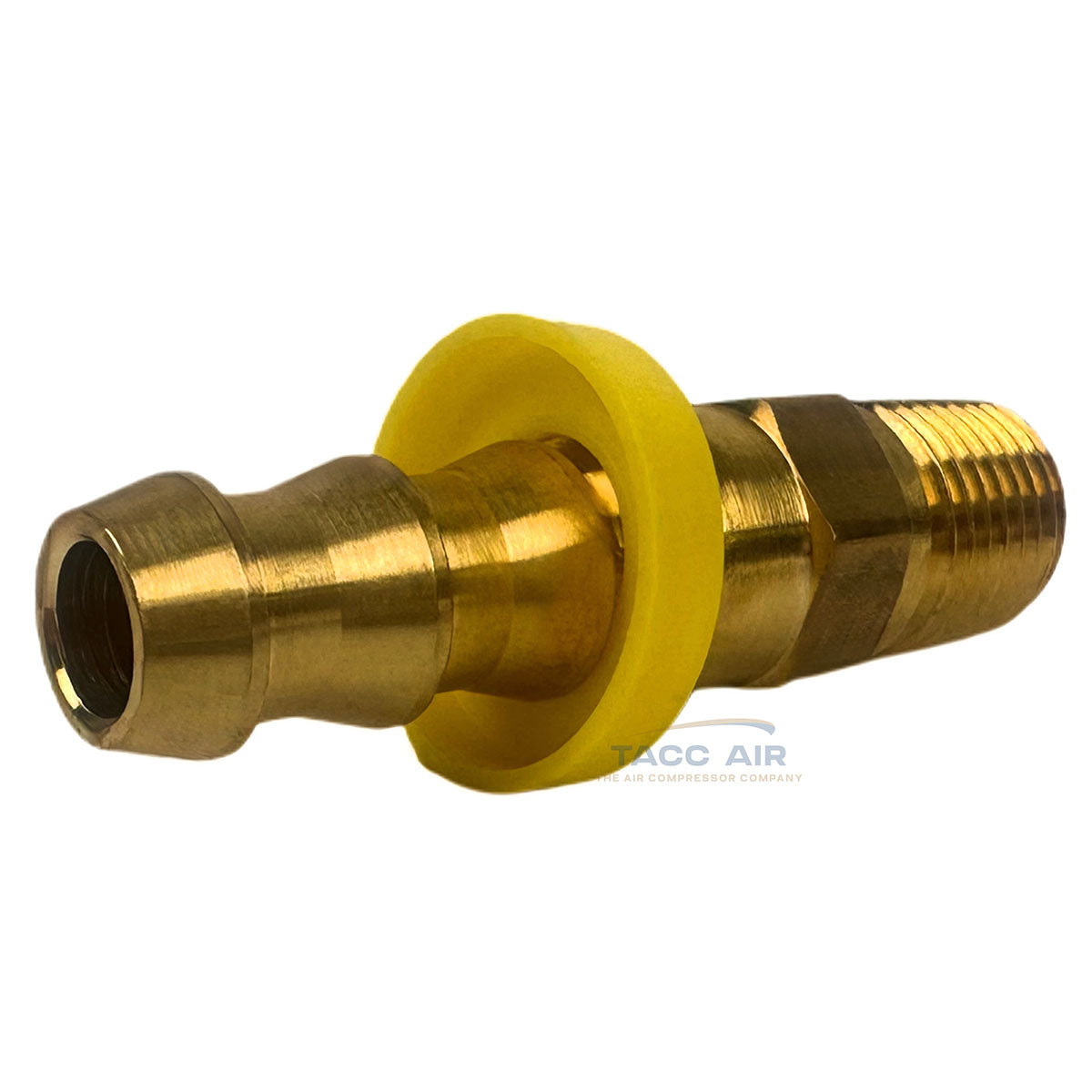 Engineered for 3/8" internal diameter (I.D.) push lock air hoses. The barbed design provides a secure, leak-free connection when properly installed. The yellow collar must remain on the fitting during installation, and the hose must be fully seated and pressed against the yellow collar for proper installation.