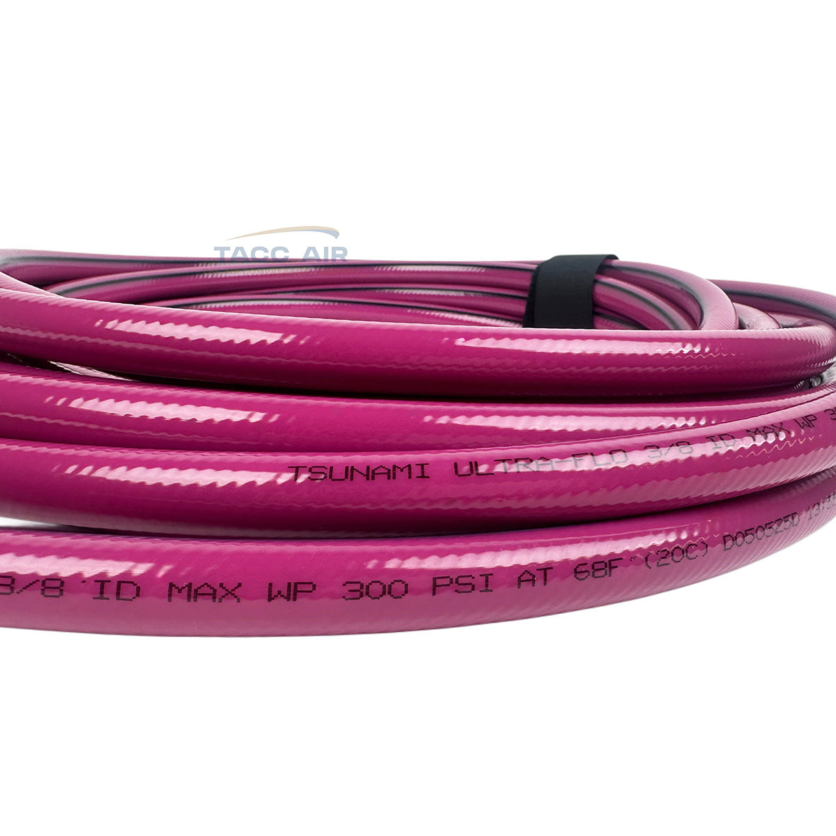 This Tsunami Ultra-Flo™ Spray Hose (Model 21999-0449) is a premium 35-foot, 3/8″ I.D. air hose built for maximum performance in paint booths, spray systems, and demanding industrial environments. Designed with a proprietary inner lining to resist breakdown and prevent contamination, it delivers clean, consistent airflow for superior results. The built-in anti-static strip reduces static buildup, while the lightweight, flat-lay construction makes it easy to handle with no kinks or tangles. With high-temperature resistance and durable fittings, this hose is engineered for long life and dependable operation.