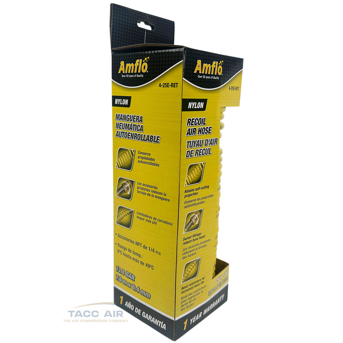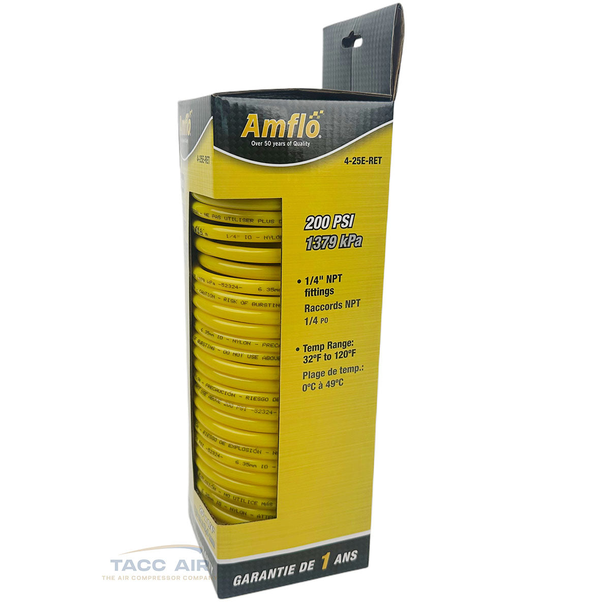 Amflo 1/4 X 25 Ft Nylon Recoil Air Hose Coiled Yellow 200 PSI 4-25E-RET