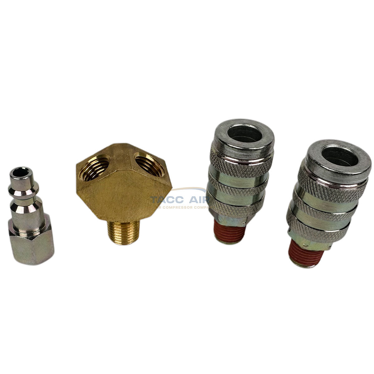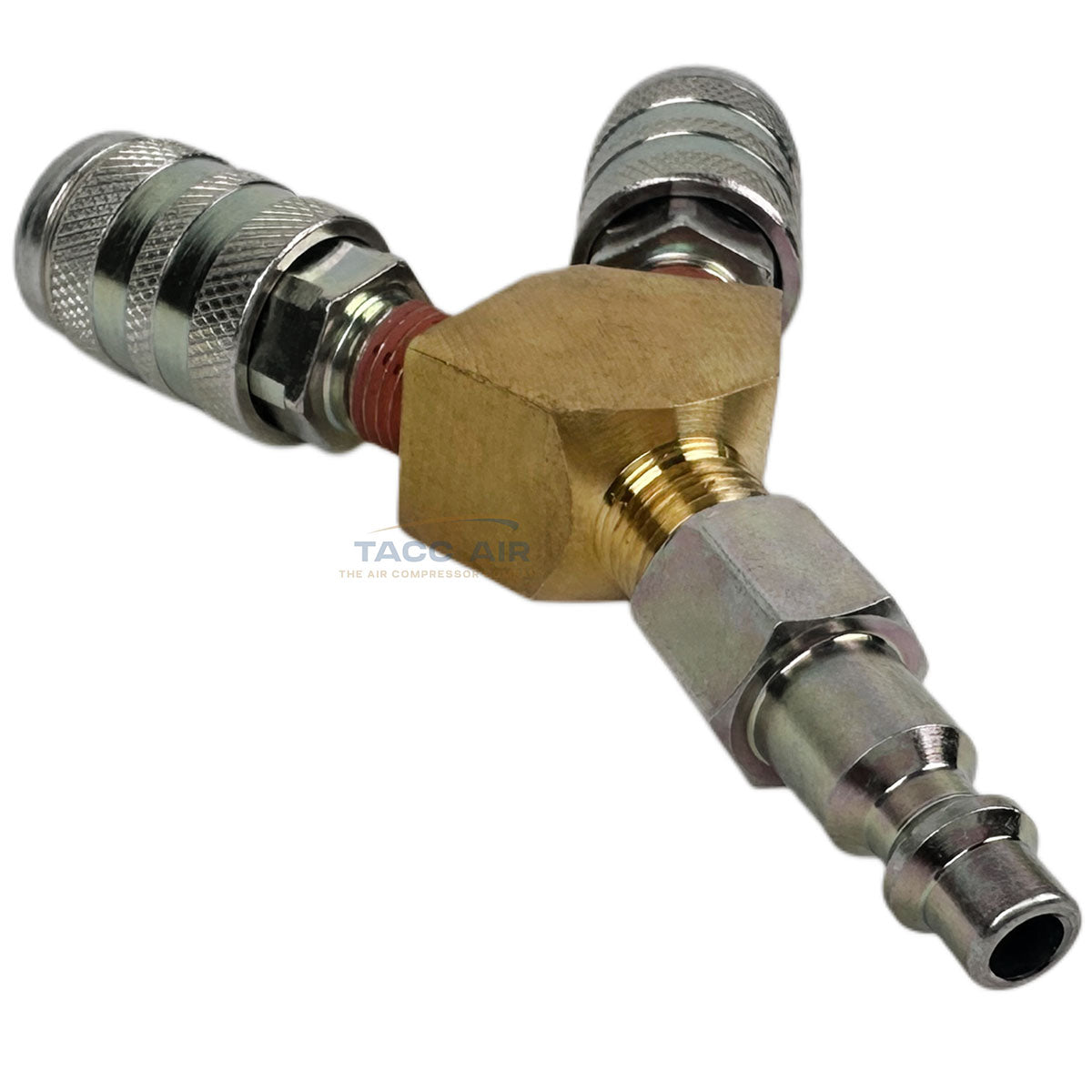 This 4-piece air line distribution combo pack includes everything you need to split one air hose or regulator output into two functional air lines. It features a solid brass 1/4" Y splitter, one industrial-style 1/4" FNPT plug for the inlet, and two industrial-style 1/4" MNPT quick coupler fittings for the outlets—ideal for construction sites, shops, garages, and other air setups.