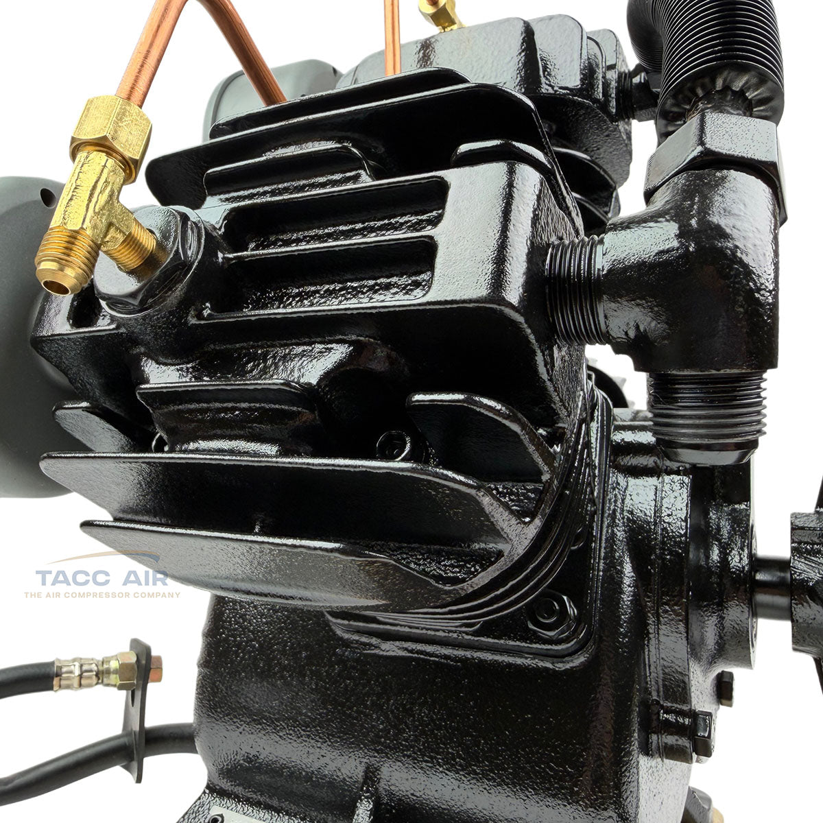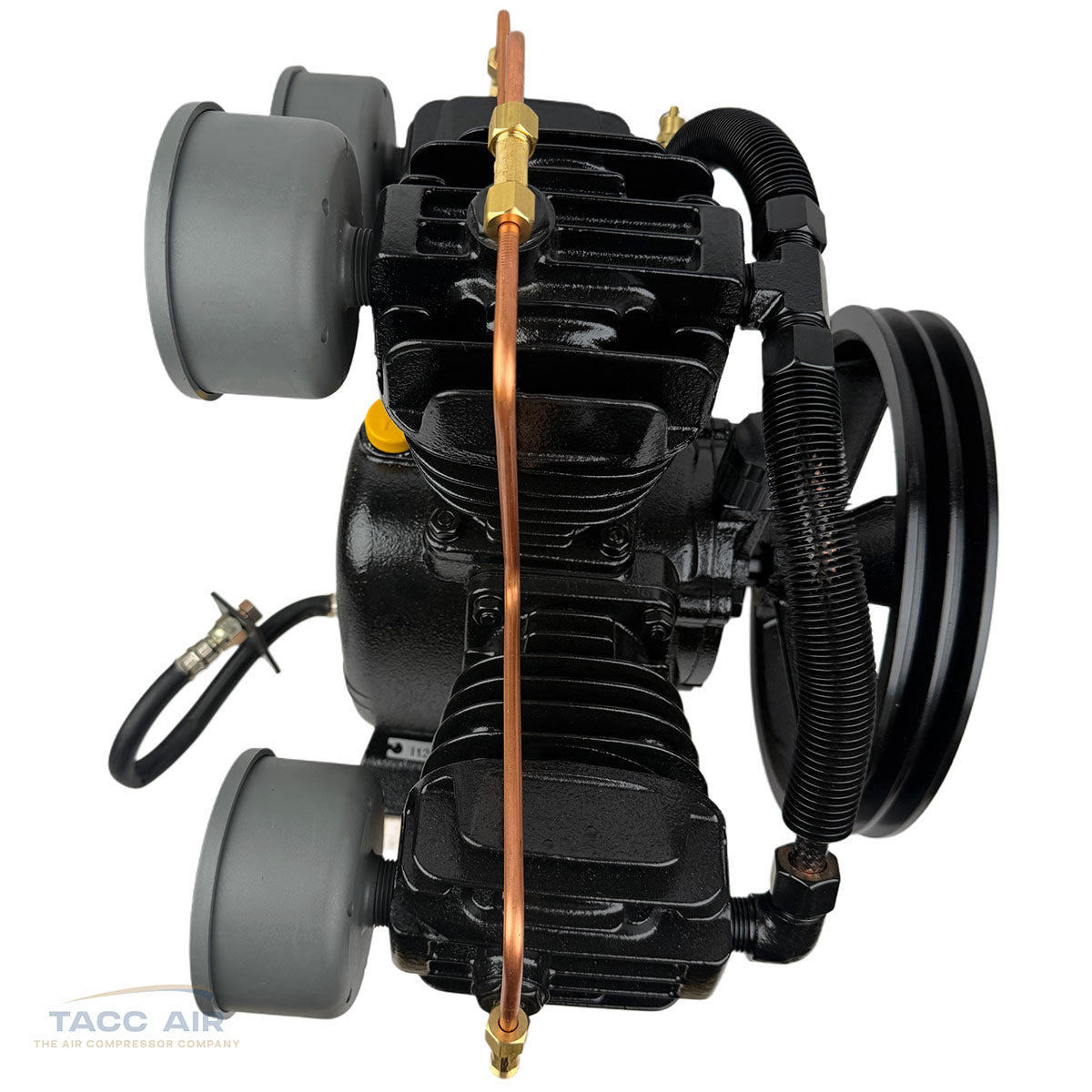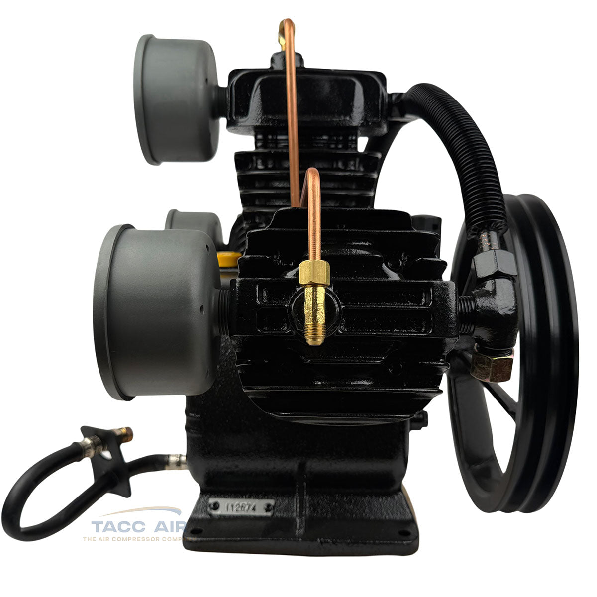 The pump also includes head unloaders connected by a 1/4" copper line designed for dual control or gas engine continuous run applications. In gas-powered setups, this system allows the pump to spin freely and unload when the compressor reaches pressure, preventing unnecessary pumping, reducing heat buildup, and greatly extending pump life.