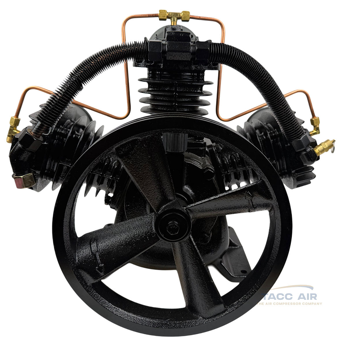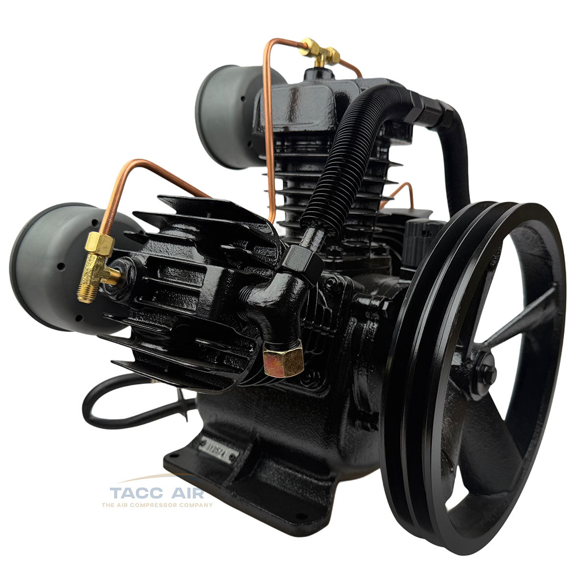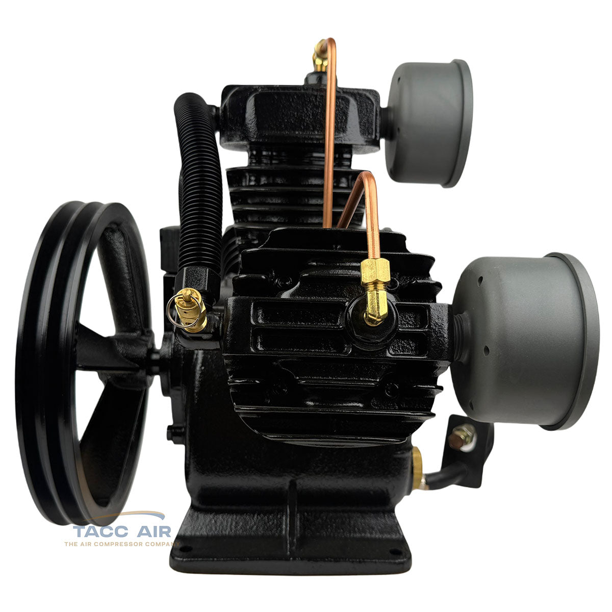 The pump also includes head unloaders connected by a 1/4" copper line designed for dual control or gas engine continuous run applications. In gas-powered setups, this system allows the pump to spin freely and unload when the compressor reaches pressure, preventing unnecessary pumping, reducing heat buildup, and greatly extending pump life.