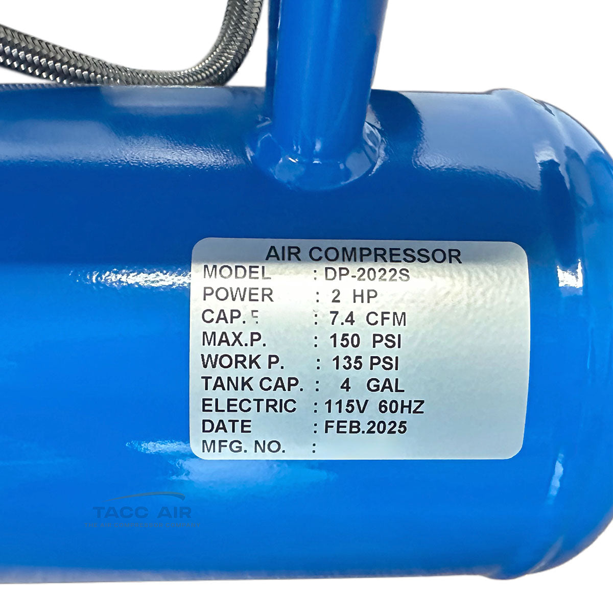 Displacement rated at 7.4 CFM, producing 6.0 CFM @ 40 PSI and 4.6 CFM @ 90 PSI, with a maximum working pressure of 135 PSI—ideal for finish work and general pneumatic use.